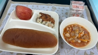 今日の献立は、きのこドリア、トマトスープ、りんご、黒糖パン、牛乳でした。酸味が効いたトマトスープ、とても美味しかったです。ごちそうさまでした。