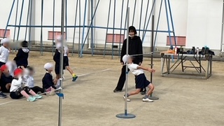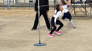 体育の学習です。柔軟性を高める運動で、高跳びのポールに張ったゴム紐をリンボーダンスのように背中を反って通り抜けていました。ゴム紐の高さはだんだん低くなっていました。