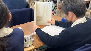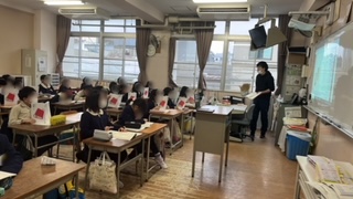 国語で百人一首の学習をしていました。デジタル教科書の詠みを聴き自分たちで詠みもして、短歌のリズムを体験していました。