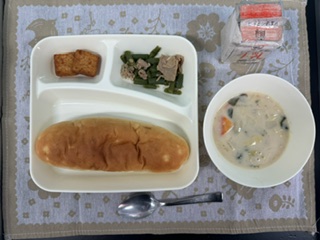 今日の献立は、はくさいのクリーム煮、あつあげのピリからじょうゆかけ、豚肉とさんどまめのオイスターソースいため、おさつパン、牛乳です。いただきます。