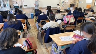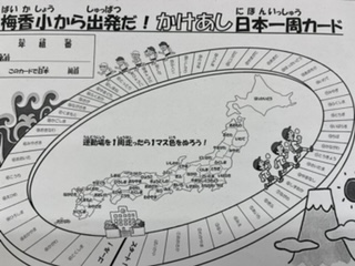 今週から始まったかけ足週間の取り組みカード「かけ足日本一周カード」を作っていました。梅香小から出発してトラック1周につき一つの都道府県に行ける形で47周で日本一周できるようになっています。昨日が高学年の初日だったので、昨日走った周のマスを色鉛筆で塗っていました。何日で日本一周できるかな?頑張ってね。