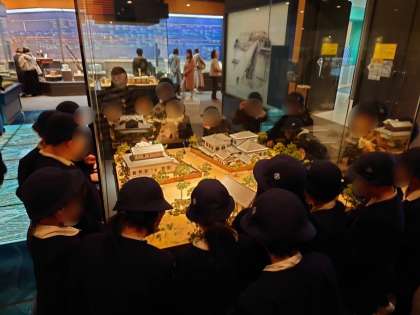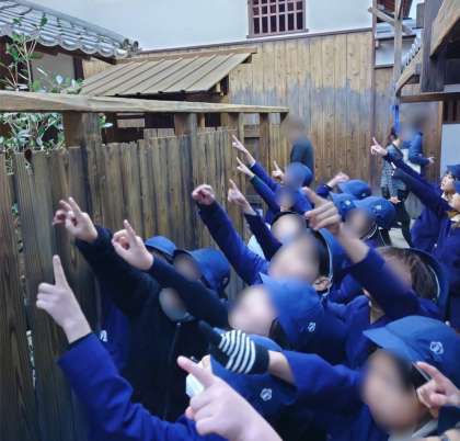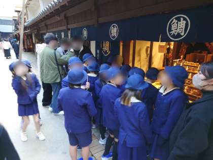 3年生は、社会見学に出かけています。行き先は「大阪くらしの今昔館」です。大阪庶民の昔の暮らしについていろんな展示や街並みの再現などがある施設です。子どもたちは興味深々で見学してます。街並み再現の場所では、上の方に何か見つけたようですね。