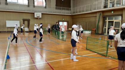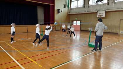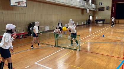 体育でソフトバレーボールの学習をしていました。本当のバレーボールのようにボールを落とさずにパスを続けるのは子どもたちにとってとても難しいので、ルールを工夫してラリーが続くよう考えてゲームしています。