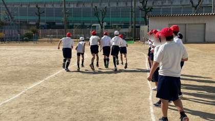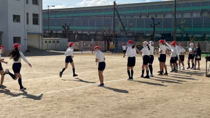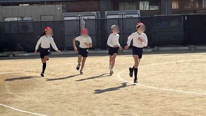 体育の学習です。陸上運動で持久走をしていました。トラック一周を◯◯秒で走ると決めて、そのラップを守って10周走り切ることに挑戦していました。2人一組で交代して頑張りました。