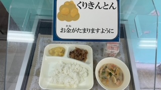 今日の献立は、鶏肉の甘辛焼き、粕汁、栗金団、ご飯、牛乳でした。栗金団は金運が上がる縁起物だそうです。給食でいただけたので金運アップしてるかな?