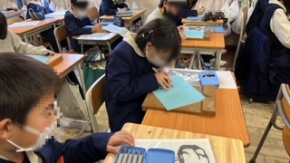 図工の学習です。木版画の製作をしていました。3年生の国語で学習した「モチモチの木」を題材にしていました。怪我に気をつけて頑張ってね!