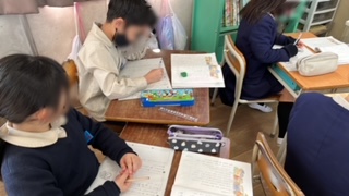 国語の学習です。「かさこ地蔵」でかさを売りに出たおじいさんの気持ちを読み取っていました。それをワークシートに書き込んでいました。