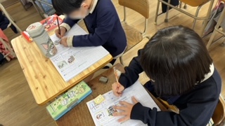 国語の学習で、漢字ドリルと漢字ノートで新出漢字を中心に漢字学習をしました。先生に指導を受けながら進めていました。