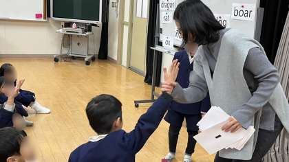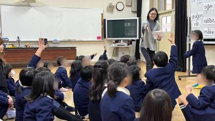 英語活動の時間です。干支の動物当てクイズをしていました。出題する子が動物をゼスチャーし、それを見て分かった子は英語でその動物を言います。