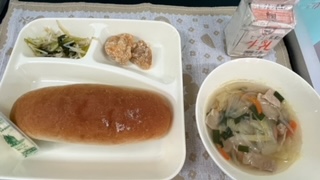 今日の献立は、鶏肉の唐揚げ、中華スープ、チンゲンサイともやしの甘酢和え、コッペパン、ソフトマーガリン、牛乳です。いただきます。