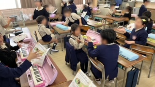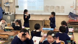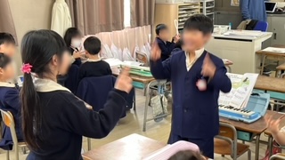 音楽の学習です。手遊び唄のジャンケンゲームでトーナメント戦を楽しんでいました。決勝に残った2人は前に出てきて対戦しました。
