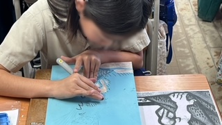 図工の学習です。木版画の製作途中です。彫るときの彫刻刀の持ち方やそえる手の位置などを繰り返し伝えて怪我しないよう注意して進めています。