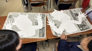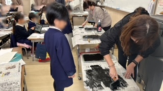 図工の学習です。1年生は紙版画です。画用紙で鬼を作っていました。版画になった時が楽しみです♪