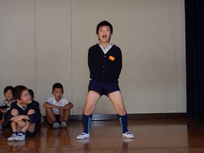 2年生は講堂の舞台の上から大きな声を出す練習です。