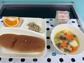 今日の献立は、ポトフ、ツナと野菜のソテー、伊予柑、黒糖パン、牛乳です。いただきます。