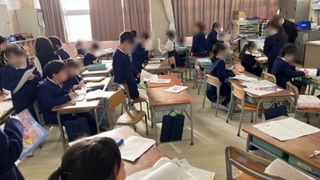2月2日(金)です。一年生の朝の様子です。連絡帳を書いている子どもの周りを、宿題提出や昨日提出してた音読カードの返却など係活動の子どもたちが行ったり来たりしていました。今日は4時限までの授業なので大忙しのようです。