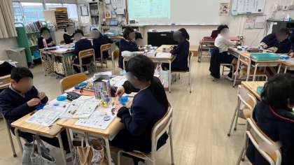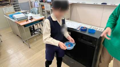 理科の学習でした。学習キットを使って磁石について学んでいました。周りにあるいろんな物をくっつくかどうか確かめたり、水の上に磁石を浮かべて方位磁針のように北を向く様子を見たりしていました。