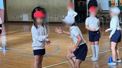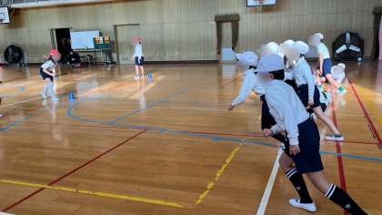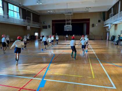 体育は体育館で紅白対抗でジャンケンゲームをしていました。このゲームは、じゃんけんで負けたらスタートからやり直しになるので運動量がとても多いです。子どもたちは、ハアハア言いながら楽しんでいました。