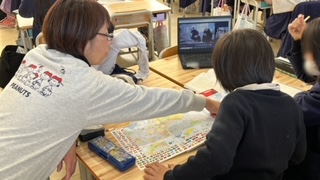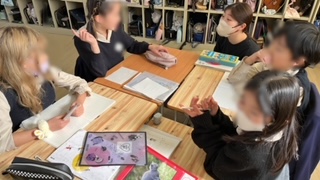 上段と中段は1組、世界の国々を紹介しようを題材に班でどの国にするのかや何を紹介するのかなどを話しあっています。