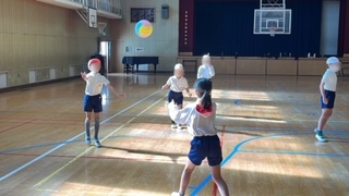 下段は2組、体育の学習でバスケットボール型のボールゲームをするための練習に取り組んでいました。みんなで上手くボールをパスしあってゴールできるよう頑張っていました。
