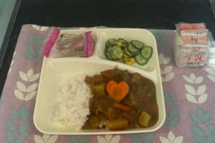 今日の献立は、チキンレバーカレーライス、きゅうりとコーンのサラダ、スイートポテト、牛乳でした。スイートポテトは初めて出ました。柔らかくて甘くてとても美味しかったです。