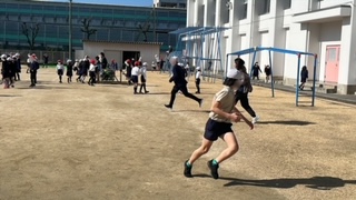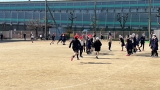 今日は少し暖かいこともあるのでしょうか、運動場にはたくさんの子どもたちが出て遊んでいました。学級全体あそびでリレーをしたり鬼ごっこをしたりしている学級もあるようです。