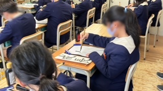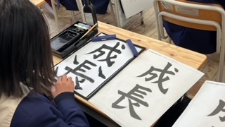 書写の学習です。毛筆で「成長」を書きます。姿勢制御よく書いていました。はらいに注意して、何度も練習していました。