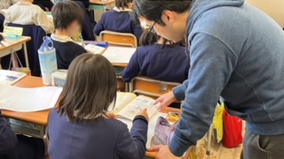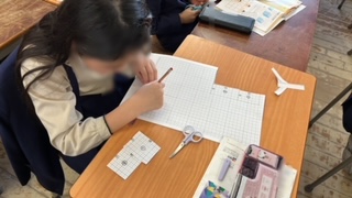 算数の学習です。厚紙でいくつかの正方形や長方形を切り抜き、それらを組み合わせて立体を作る学習です。紙上や映像で見て特徴を捉えていた直方体や立方体を具体物として捉えられるようにしています。