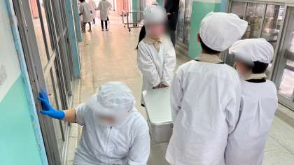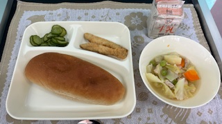 今日の献立は、わかさぎフライ、洋風煮、きゅうりのピクルス、黒糖パン、牛乳です。気をつけて運んでくださいね。いただきます!