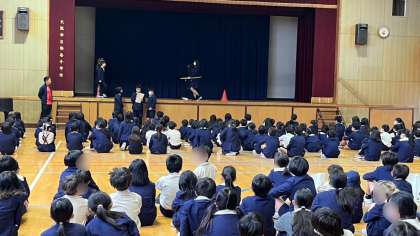 児童集会は体育館でのフラフープリレーでした。高学年と低学年のペアで走りました。みんな笑顔で頑張っていました。