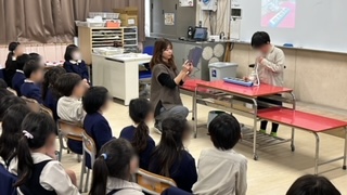写真は、上段が1年生の生活科、下段が2年生の生活科の学習発表の様子です。