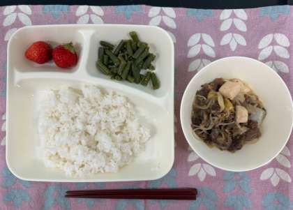 今日の献立は、すき焼き煮、三度豆の胡麻和え、いちご、ご飯、牛乳でした。ごちそうさまでした。