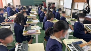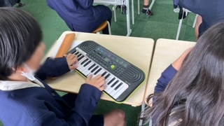 音楽の学習です。電子ピアノを使った演奏の学習でした。久しぶりに使うので、まずは少し扱いヲ思い出してから課題曲に入りました。