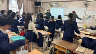 「swinging!」英語の号令に従って身体を動かした後、学校施設を英語で紹介する学習をしました。自分の好きな施設を友だちに英語で紹介します。