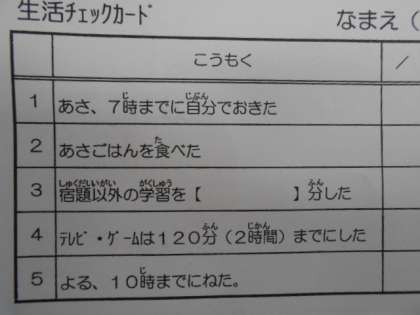 子どもたちの基本的生活習慣を見直すために、下のような「生活チェックカード」を配りました。子どもたちは、学校か家で毎日の生活をチェックします。