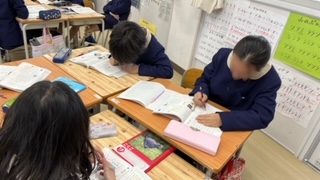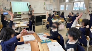国語の学習です。漢字の送り仮名についての問題に取り組んでいました。「明るい」と「明かるい」、「合わせる」と「合せる」などどちらか2択の問題でした。答え合わせは、みんなでどちらかに手を挙げてたあと、正解を教えてもらってました。