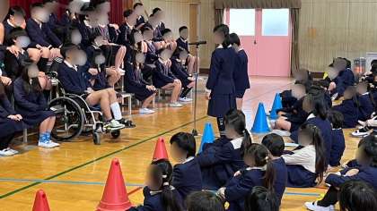 在校生全員で6年生の卒業を祝い、楽しい会で送ります。入場した6年生に、在校生から、まずはお祝いの言葉と歌を送りました。