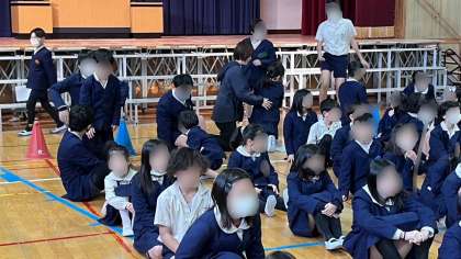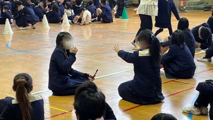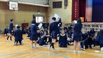 お祝いの言葉と歌のプレゼントの後、6年生と在校生がまじっての伝言ゲームをしました。みんなとても楽しそうでした。
