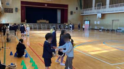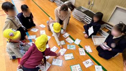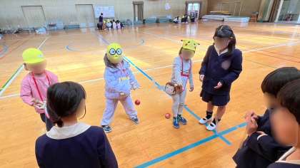 遊びコーナーには、けん玉やカルタ、輪投げだるま落とし、お手玉、ジャンケンゲームあり、それぞれで1年生が園児たちが楽しめるようにお世話していました。