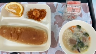 今日の献立は、エビのチリソース炒め、中華粥、はっさく、おさつパン、牛乳でした。美味しかったです、ごちそうさまでした。