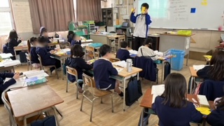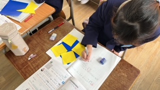算数の学習です。分数の基礎概念の学習です。「物(この時間では、色紙を使っていました)を二等分した一つを1/2と言います。」「物を四等分した一つを1/4と言います。」これらの概念をしっかり理解しておかないとこれからとても困るので、具体物を使って丁寧に指導しています。
