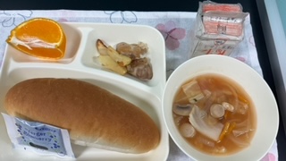 今日の献立は、鶏肉とじゃがいものガーリック焼き、ウインナーとてぼ豆のスープ、デコポン、コッペパン、ブルーベリージャム、牛乳です。いただきます。