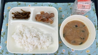 今日の献立は、マグロの甘辛焼き、豚汁、茎わかめの佃煮、ご飯、牛乳でした。ごちそうさまでした。