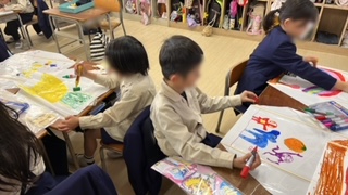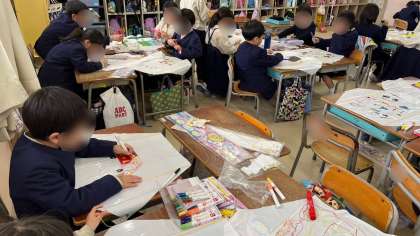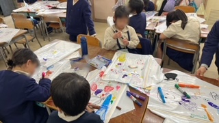 図工で凧作りをしていました。白いビニル製の凧に色とりどりの絵を描いていきます。自分だけの凧が出来上がっていました。