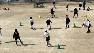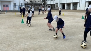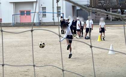 体育のサッカーの学習です。ボールを取り合うミニゲームやドリブル練習をしたあと、シュート練習をしていました。