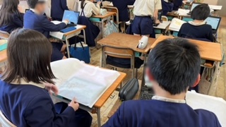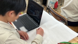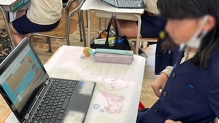 図工の学習です。図工作品袋にいろいろな絵を描いていました。中にはタブレットで自分の好きなキャラクターを探し出して、参考いる子もいました。