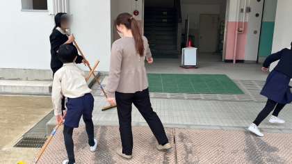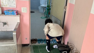 運動場から上がってきた砂を運動場に掃き戻しています。トイレは汚れを水で流して綺麗にしました。スリッパを整頓して終わりです。