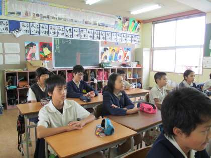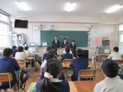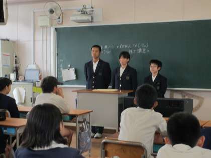 お昼休みに、春日出中学校の生徒会の方が3名、今月27日に行われる、中学校体験の説明に来校しました。3名の中には、本校の卒業生もおり、成長した姿をみせてくれました。