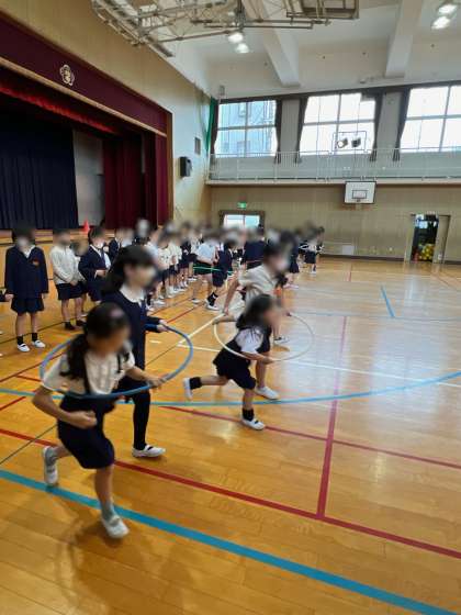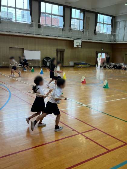 今日の集会は、たてわり班対抗のリレーを行いました。