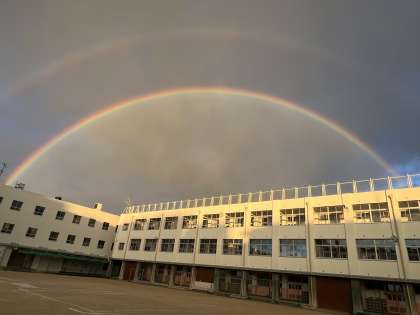 運動場から見ると、校舎の屋上に、虹の看板がかかっているようにも見えました。